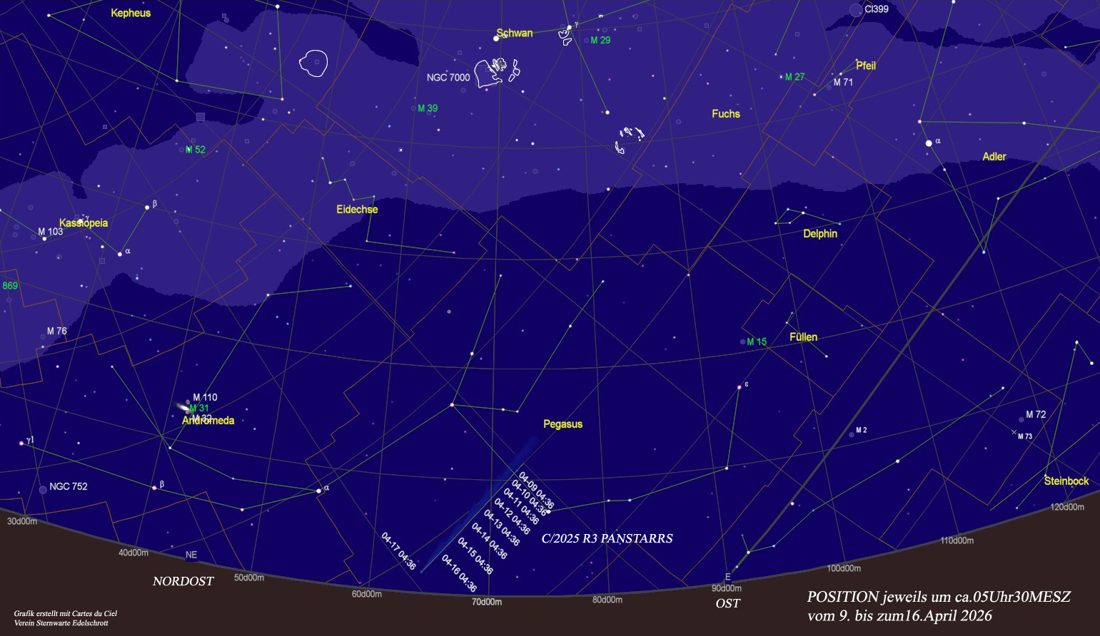 Frühaufsteher sollten am Morgenhimmel ihre Ferngläser und Teleskope in Richtung Ost-Nordost richten, auf das Sternbild Pegasus. Dort kann man den Kometen C/2025 R3 PANSTARRS aufspüren und dieser entwickelt sich sehr gut! Derzeit liegt seine scheinbare Helligkeit bei 5,5 mag und zeigt eine steigende Tendenz. Fotos des Kometen zeigen einen ausgeprägten Schweif! Momentan nähert sich der Komet seinem Perihel (19. April) sowie seiner Erdnähe (26.). Dabei taucht er aber zusehends in die Morgendämmerung. Im Laufe der Woche nimmt der Einfluss des Mondes ab, so dass zum kommenden Wochenende die beste Zeit des Kometen sein wird!